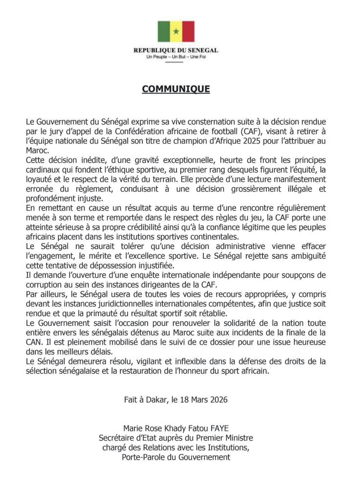 塞内加尔政府对非洲足球联合会(CAF)上诉委员会剥夺塞内加尔国家队2025年非洲国家杯冠军头衔并将其授予摩洛哥的决定表示深切愤慨。