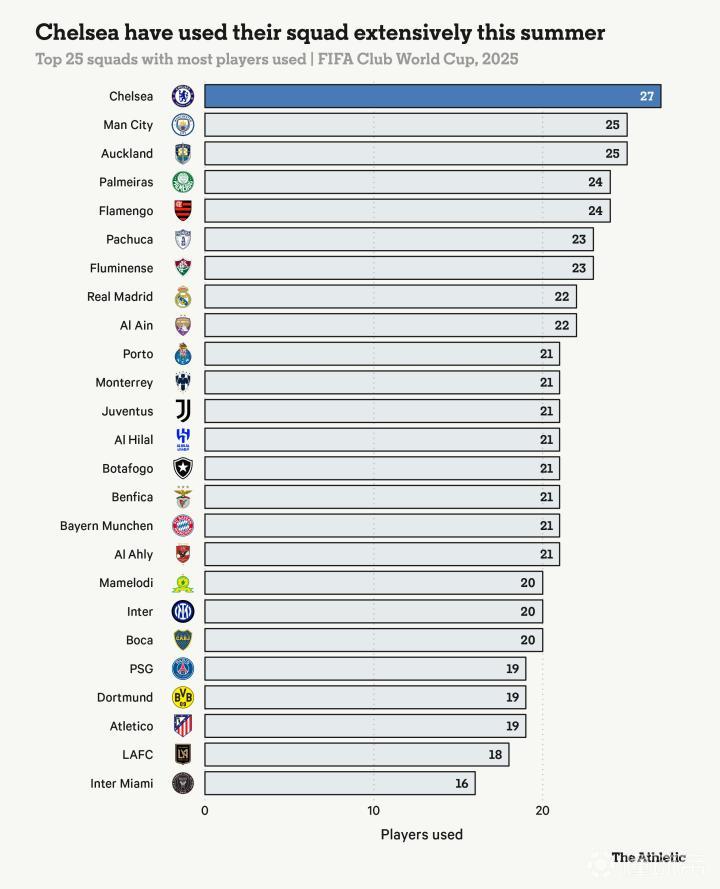 你可能会正确地指出,他们也确实比其他许多对手踢了更多的比赛,但同为半决赛球队的弗鲁米嫩塞(23人)、皇家马德里(22人)和巴黎圣日耳曼(19人)都远未达到马雷斯卡使用的球员数量。