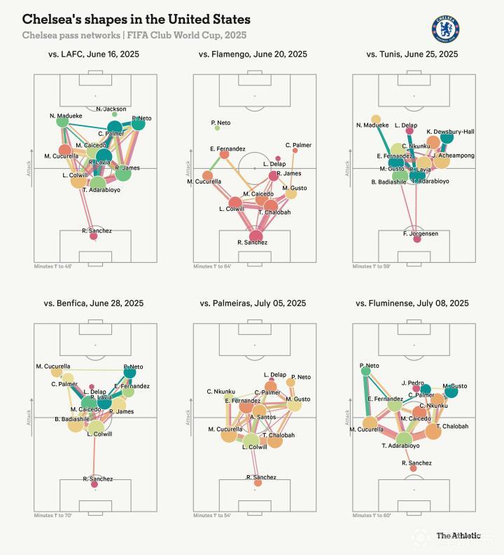 然而,切尔西主教练进行的许多其他轮换更具实验性。一个显著的调整是帕尔默在切尔西战胜本菲卡的16强赛中出现在进攻左路的首发位置。另一个是詹姆斯在对阵弗拉门戈时作为首发中场的内收角色,这个尝试明显不太成功。