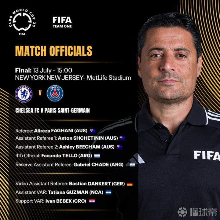官方消息,切尔西对阵巴黎圣日耳曼的2025年世俱杯决赛裁判组人选已经确定。