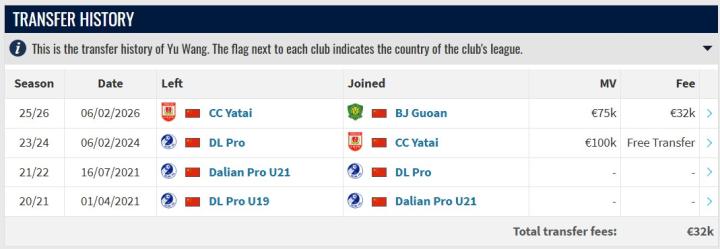 据德转信息显示,王禹今年冬窗从长春亚泰加盟北京国安的转会费为3.2万欧元(约合人民币26万元)。