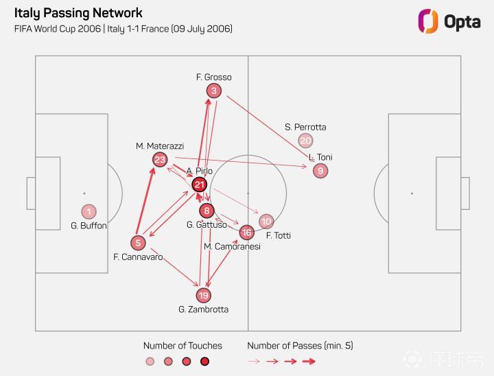 那是一个奇怪的4-2-3-1,因为前场四人组几乎起到了诱饵作用,而非主要进攻威胁。佛罗伦萨的卢卡-托尼刚刚赢得了欧洲金靴奖,他的31个进球是近半个世纪以来意甲联赛的最高纪录。但他在那届世界杯上仅在一场比赛中进球——四分之一决赛3-0战胜乌克兰的比赛中梅开二度。传奇人物托蒂出任10号位,但人们赞扬更多的是他的跑动而非天赋。毛罗-卡莫拉内西是出生于阿根廷的勤奋型中场,而非“真正”的边锋,而出生于英格兰的西蒙内-佩罗塔通常是一名中前卫,但在边路也尽职尽责。