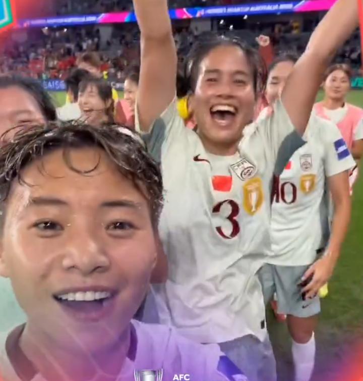 比赛结束后,面对亚足联官方赛后镜头,中国女足核心球员王霜与队友一起面对镜头激情庆祝,难掩喜悦之情。王霜用英语和中文向球迷表达了感谢,她说道:“大家好,我们小组第一出线了,爽!”