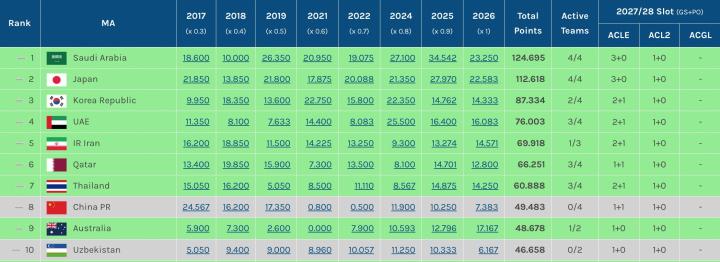 随着墨尔本城被武里南联淘汰,无缘亚冠精英联赛八强,澳超的技术积分仍差中超0.3分,且全军覆没。2027-28赛季,中超有望继续保留三个亚冠席位,分别是一个亚冠精英联赛正赛,一个亚冠精英联赛附加赛,一个亚冠二级联赛正赛。