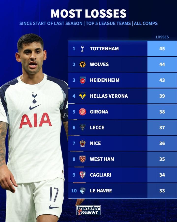 北京时间2月11日,根据德转最新的数据统计,热刺上赛季以来各项赛事输掉45场,是五大联赛中最多的球队,比英超垫底的狼队还多1场。