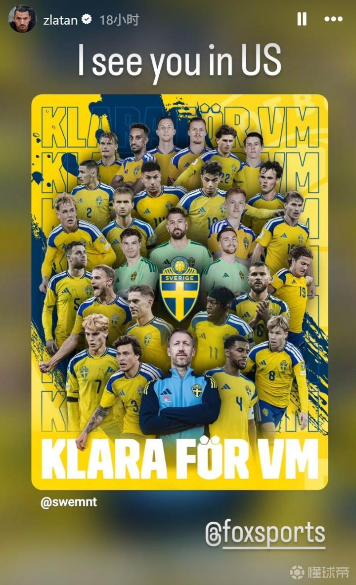 4月1日,瑞典队在世界杯欧洲区附加赛中战胜波兰队成功晋级后,在个人社交媒体上,瑞典传奇球星伊布分享了瑞典国家队的海报,为球队成功晋级世界杯送上祝贺。