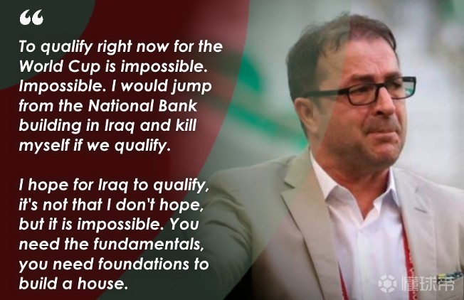 前教练彼得罗维奇曾承诺,如果球队进入世界杯,他将从中央银行大楼跳下。我现在愿意往他的银行账户里打钱,给他购买前来伊拉克的机票,邀请其兑现诺言。不过我也希望他见证我们今夏在世界杯的旅程,我会给他配上降落伞的。