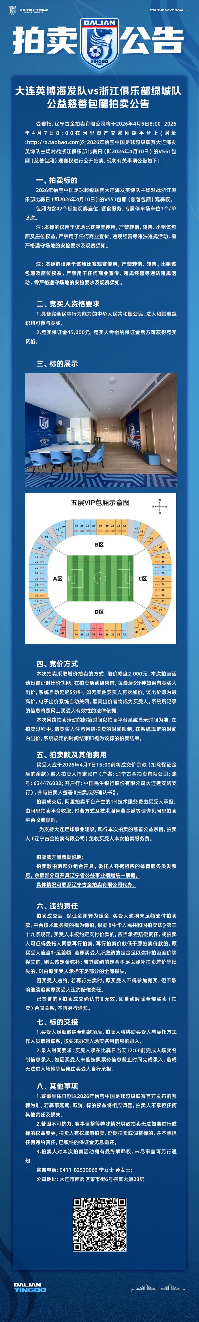 北京时间4月10日,中超第5轮,大连英博将坐镇主场迎战浙江队。赛前,大连英博官方发布公告,称俱乐部将公开拍卖V551包厢观赛权(慈善包厢),起拍价50000元。
