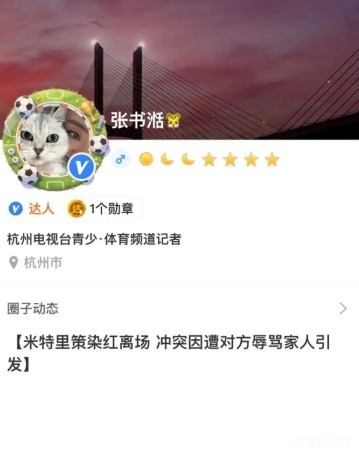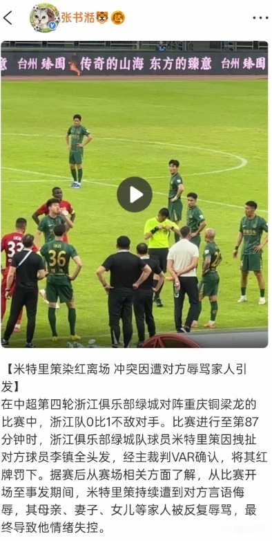 中超第4轮,浙江队主场0-1不敌重庆铜梁龙,本场比赛米特里策两度揪李镇全头发染红。赛后,浙江跟队记者张书湉表示,米特里策的家人被李镇全反复辱骂,导致情绪失控。但目前她已将这条动态删除,而她其他社交平台的评论区,已沦为球迷批评与声讨的重灾区。