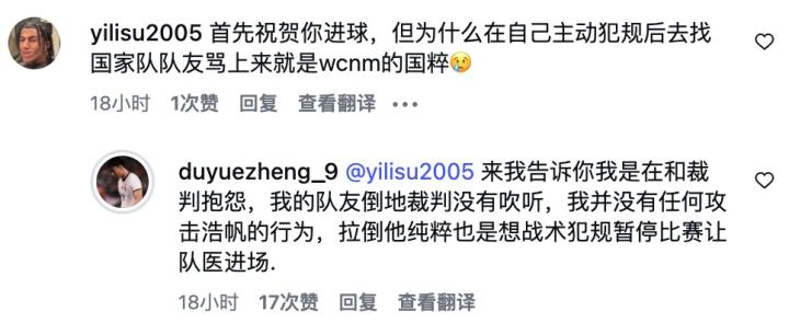 昨天,杜月徵社媒的评论区有球迷评论:“首先祝贺你进球,但为什么在自己主动犯规后去找国家队队友骂上来就是****的国粹。”