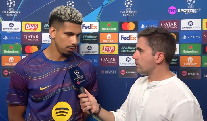 欧冠1/4决赛首回合,巴萨主场0-2输给马竞,巴萨后卫阿劳霍赛后接受了TNT体育巴西频道的采访。