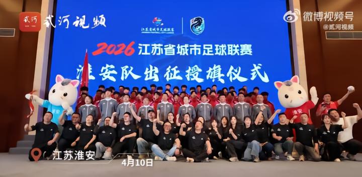 据荔枝新闻消息,4月10日,江苏淮安,2026年江苏省城市足球联赛即将拉开展幕,淮安队举行出征授旗仪式。