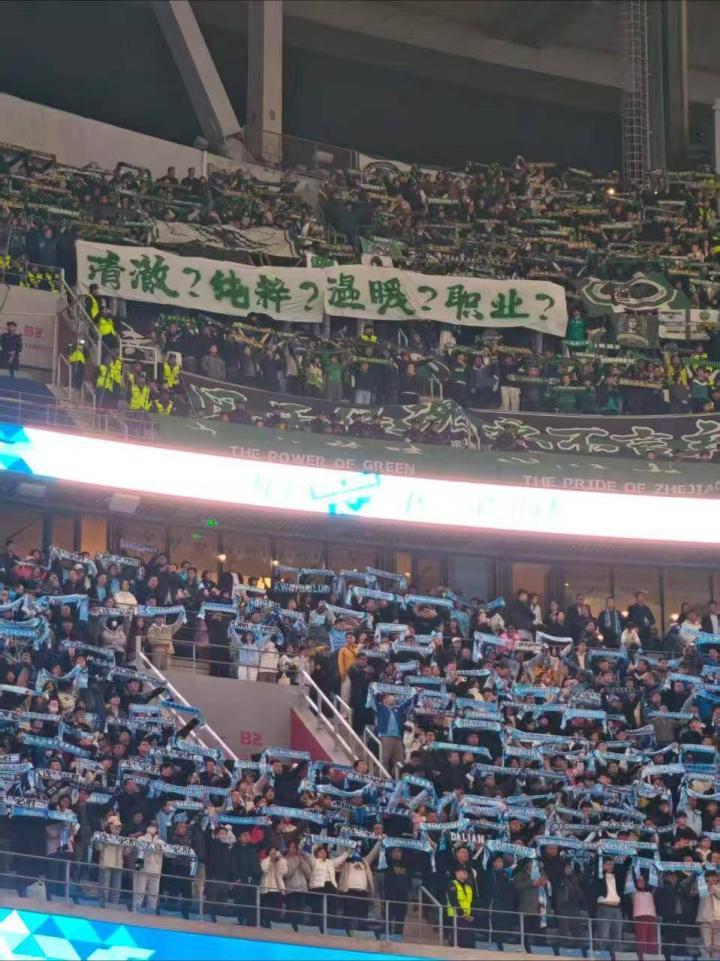 北京时间4月10日,浙江客场对阵大连英博,比赛过程中浙江球迷在客队区拉起横幅,白底绿字发出连环问:“清澈?纯粹?温暖?职业?”,引发关注。
