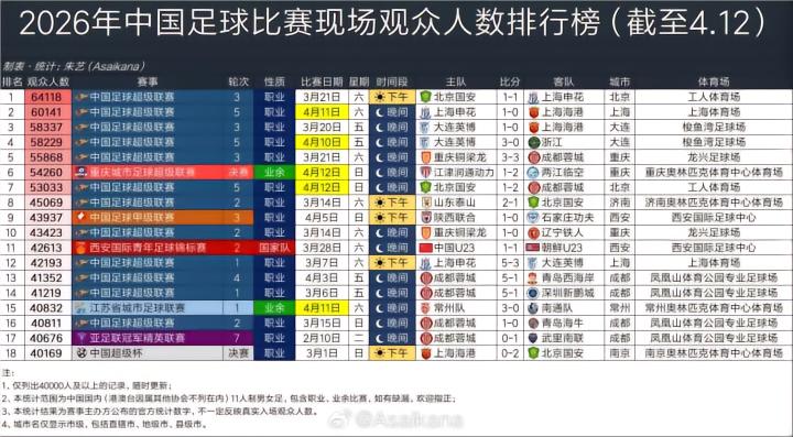 北京时间4月12日,德国转会市场亚洲区管理员朱艺@Asaikana 统计了2026年中国足球比赛现场观众人数排行榜。
