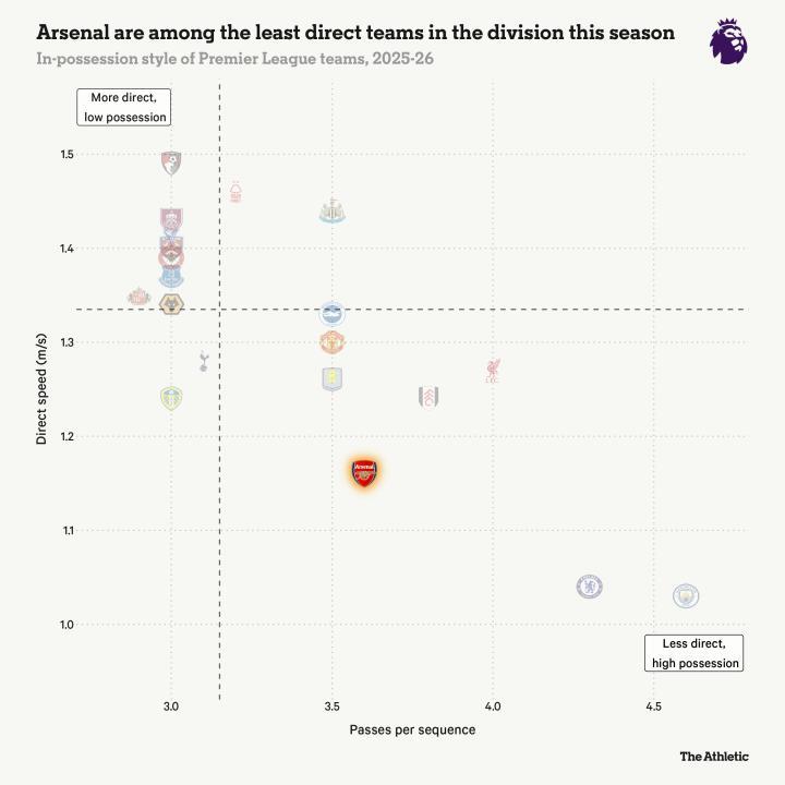 在转播镜头里可能不一定看得见,但阿森纳的前锋们很少在队友拿球时突然插向防线身后。即使他们接不到传球,这些跑动也能带走防守球员,为其他地方创造更多空间。没有这种无球跑动,进攻就会变得容易被预判。