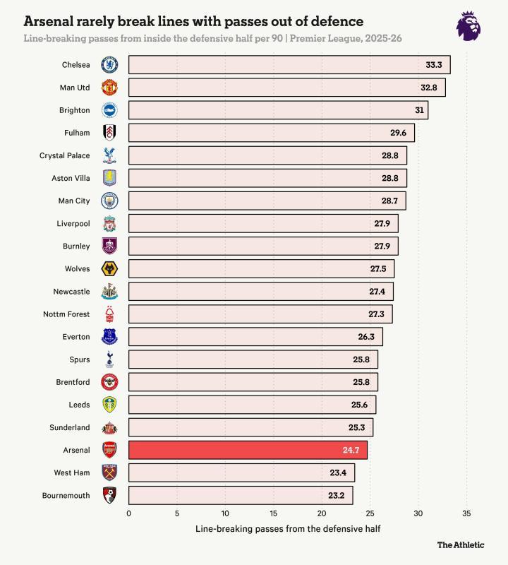 下面的柱状图显示,本赛季阿森纳在本方半场内完成的穿透防线的传球次数极少,只有西汉姆联和伯恩茅斯比他们更少。虽然这项数据有一些限制条件(对手可能不会像对其他球队那样以同样的强度压迫阿森纳,从而减少了他们传出穿透球的机会),但它确实表明,阿森纳在从后防线上送出犀利传球方面遇到了困难。那种通过三线之间一脚传球快速推进的日子,感觉已经是很久以前的事了。