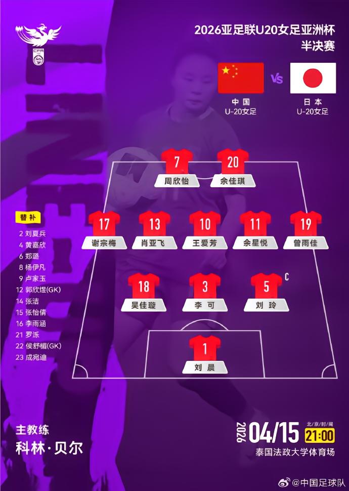 北京时间4月15日21:00,U20女足亚洲杯半决赛,中国U20女足对阵日本U20女足,赛前双方公布首发: