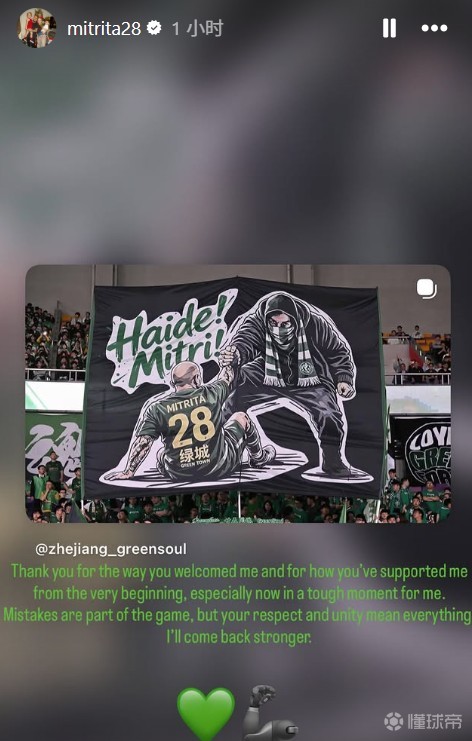 中超第6轮,浙江俱乐部绿城队主场0-0战平北京国安。比赛中,浙江绿魂球迷协会对此前被禁赛的米特里策进行了声援,在比赛中,他们举起了米特里策的Tifo。