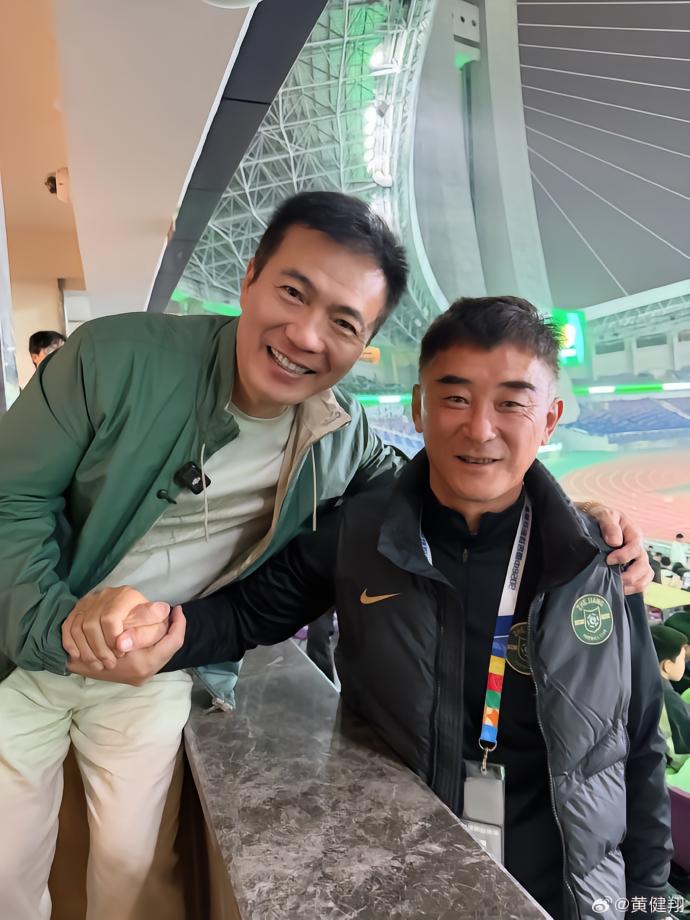黄健翔在社交媒体上写道:“第一次在黄龙体育场看球,遇到两位老朋友,傅博,现在浙江队教练组。另外一位,大家都认识,国足主帅邵佳一。他自己说,现在每到周末就四处奔波看联赛,考察国内的队员。明天他要去大连。大连的朋友们准备好了吗? ”