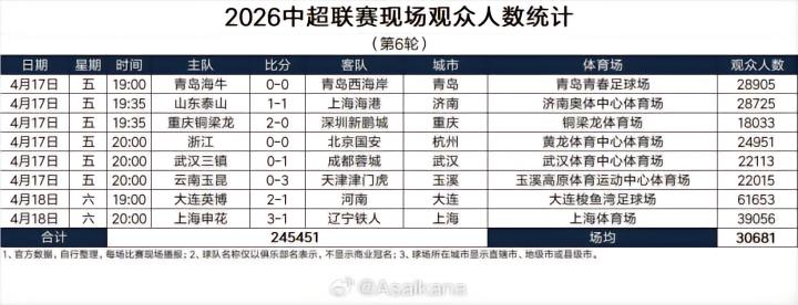 4月18日晚上,中超联赛第6轮全面结束,共有24万5451人现场观看了比赛,场均超过了3万人。