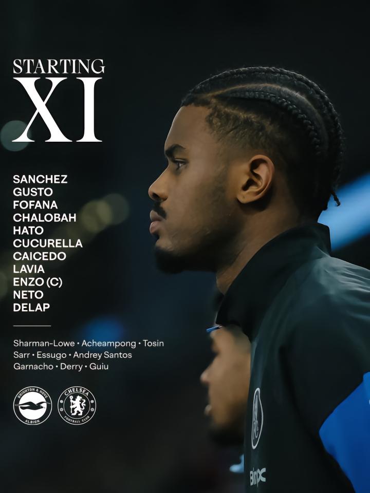 切尔西首发:1-罗伯特-桑切斯、27-古斯托、29-韦斯利-福法纳、23-特雷沃-查洛巴、21-哈托、3-库库雷利亚、25-莫伊塞斯-凯塞多、45-拉维亚、8-恩佐-费尔南德斯、7-佩德罗-内托、9-德拉普