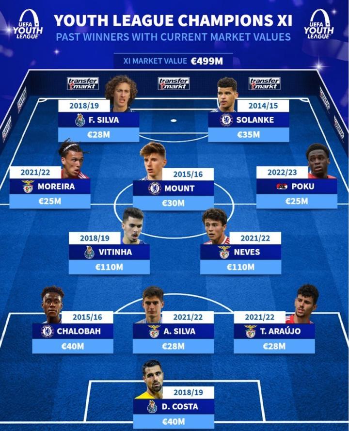 北京时间4月24日,在皇马U19赢得了本赛季欧青联的冠军之后,德转统计出了赢得过欧青联冠军目前德转身价最高的11人阵容,巴黎的中场双星维蒂尼亚和若昂-内维斯领衔,芒特在列。