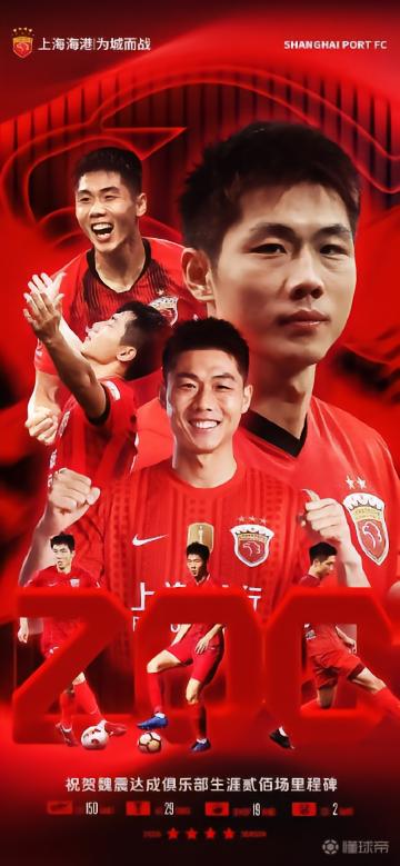 在代表上海海港完成200次出场后,球员魏震发文纪念了这一时刻。